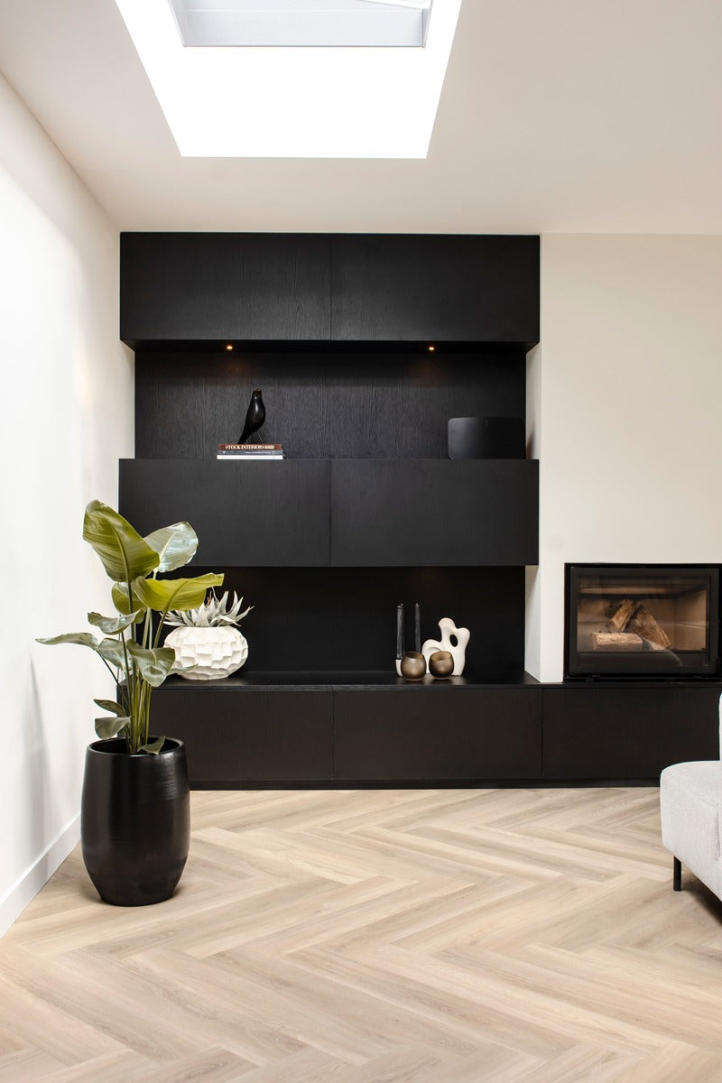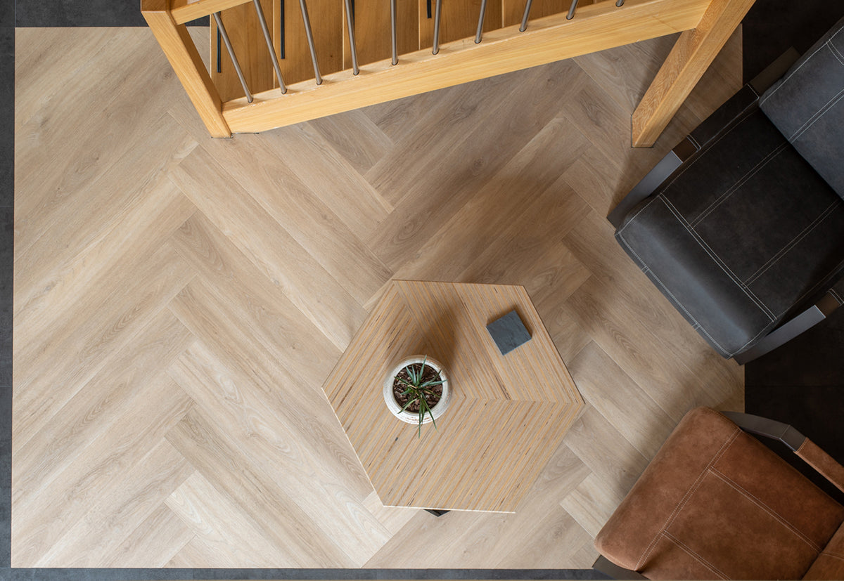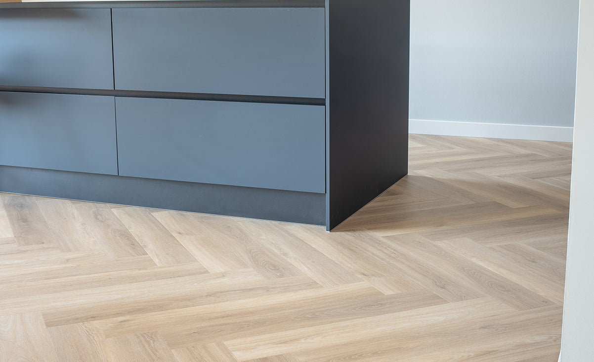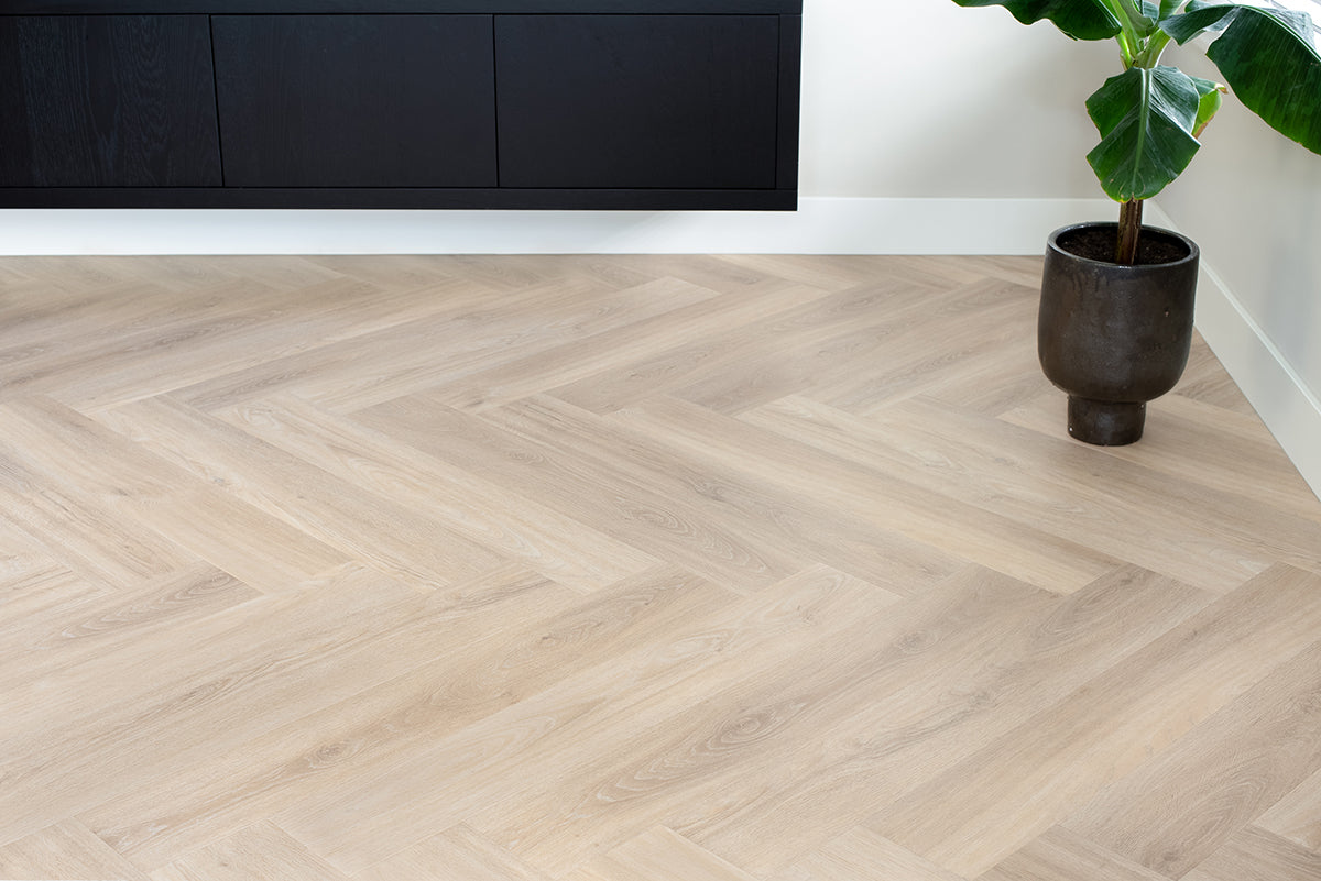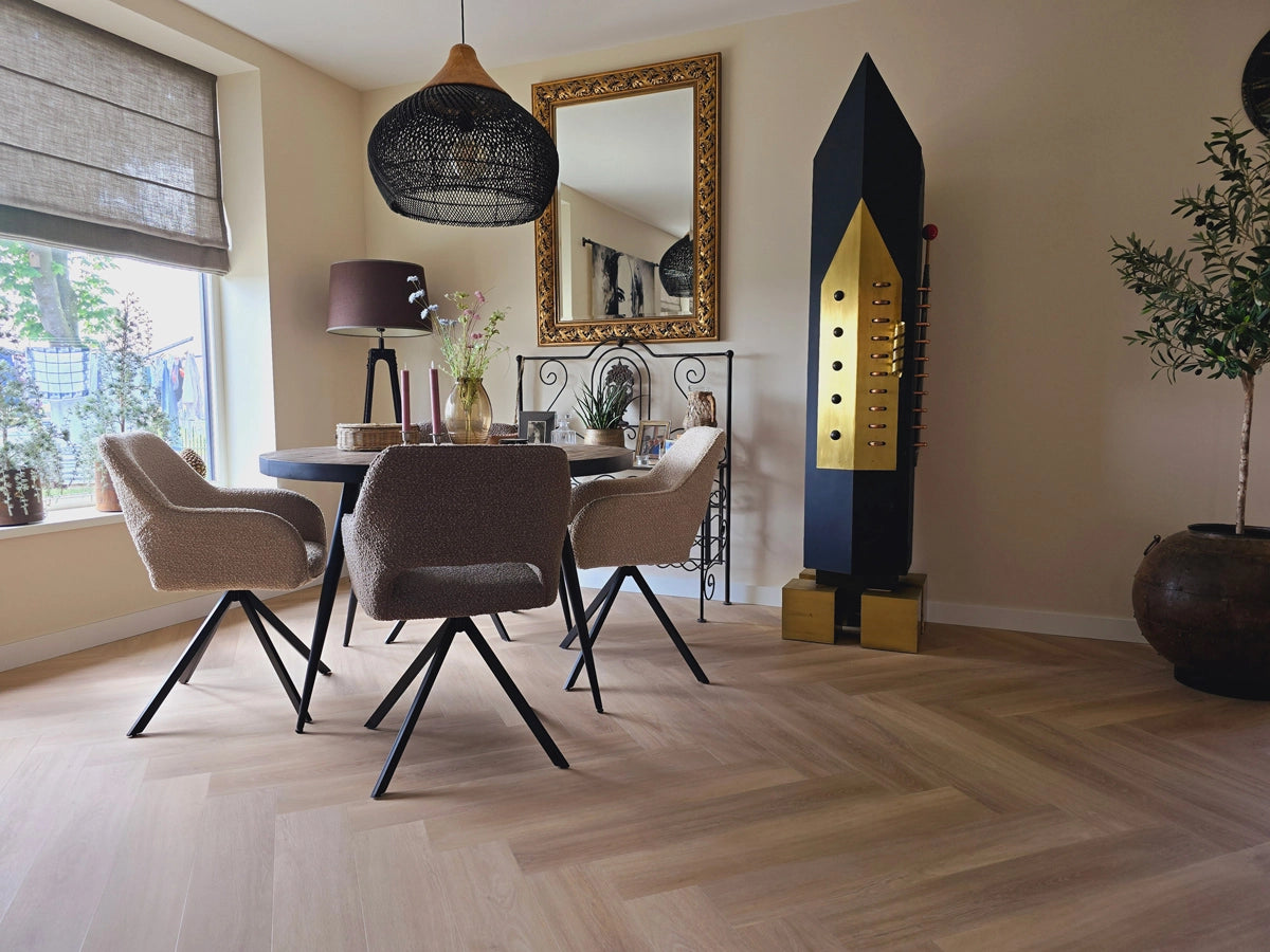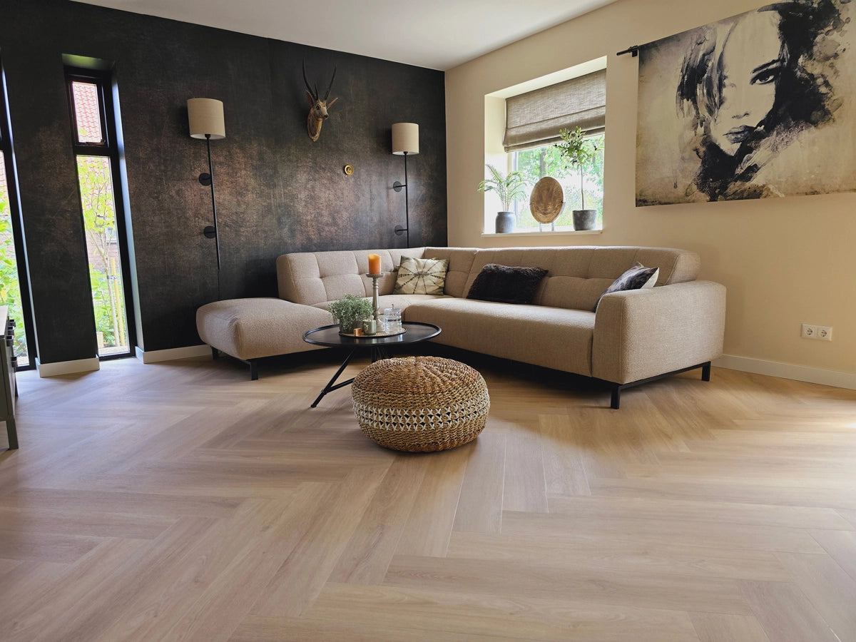 Ontdek het Floer Walvisgraat PVC - Orka Onbehandeld 2.0; extra groot en indrukwekkend visgraat PVC. Het populaire Walvisgraat PVC in de licht eiken tint Orka Onbehandeld is nu uitgerust met de unieke MEGAMAT afwerking! Door zijn extreem matte finish en realistische houtlook, heeft deze XL visgraat PVC vloer een uitstraling van écht eiken hout. Dit, gecombineerd met alle voordelen van PVC. De walvisgraat vloeren zijn langer, breder en groter dan de "standaard" visgraat vloeren. PVC vloeren zijn eenvoudig te onderhouden en ook 100% waterproof. De uiterst sterke PU-slijtlaag van 0,55 mm zorgt ervoor dat de vloer beter tegen krassen kan. Let op: een PVC vloer is niet volledig krasvrij, de toplaag is bestemd om slijtage te verminderen.